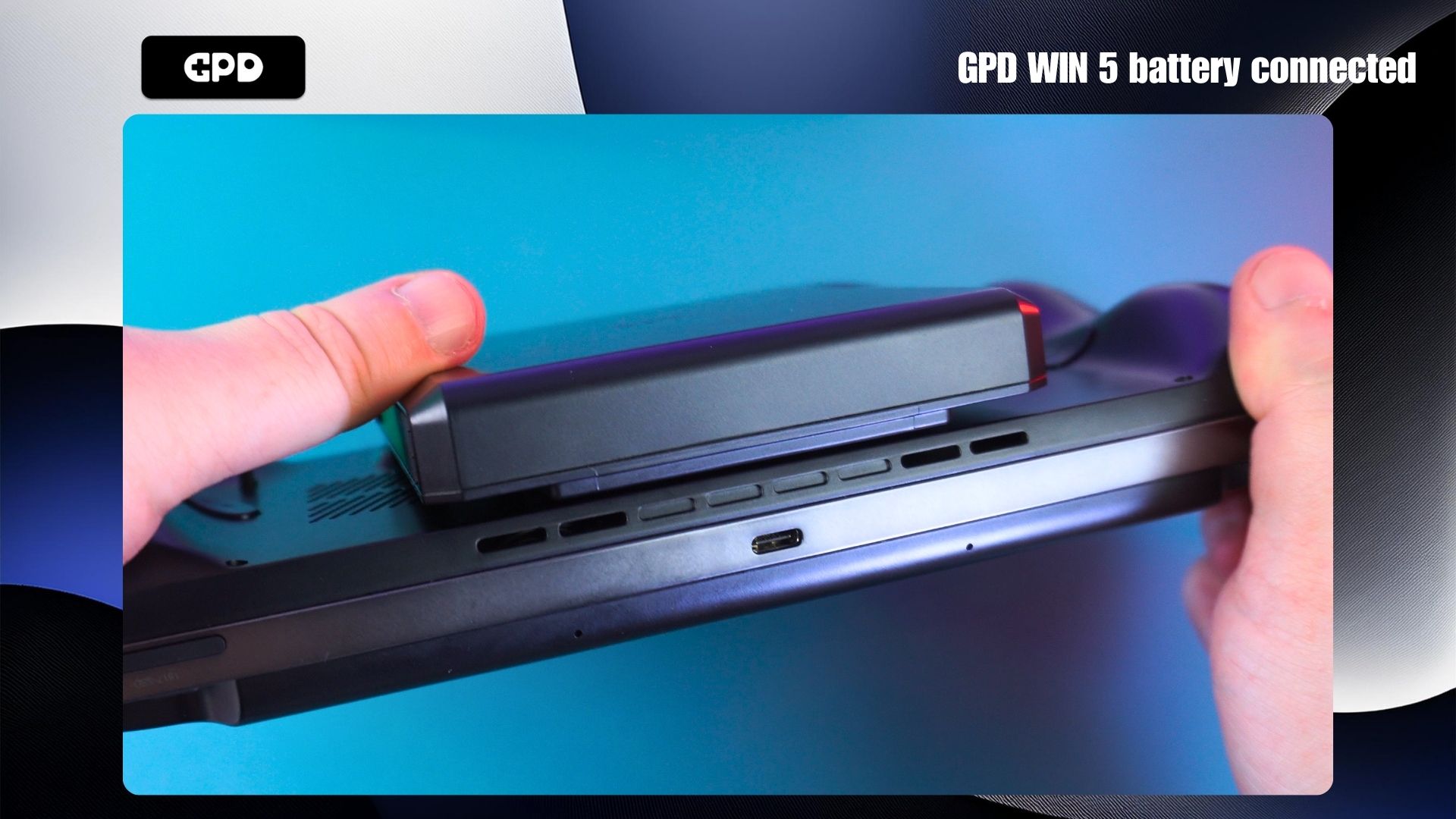 And then there is the external battery. Our battery testing is an essential component of this GPD WIN 5 review. When pushed to its maximum 80W TDP at full brightness while looping Cinebench 2024, the battery lasted for approximately 42 minutes. In a more relaxed scenario, sitting idle on the desktop at 55W TDP and 50% brightness, it provided around 10 hours of runtime. Average usage will vary depending mainly on the TDP, but for an average game without pushing everything to the maximum, lets say two to three hours.