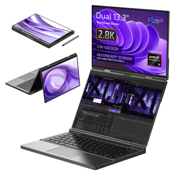 Den sekundære skjermen kan foldes bak den primære, slik at enheten sømløst forvandles til en vanlig bærbar PC. Denne fleksibiliteten gjør at brukerne kan veksle mellom bruk av en vanlig bærbar PC og en nettbrettlignende opplevelse, med begge skjermene tilgjengelige avhengig av behov. Når enheten er foldet sammen, er den like kompakt som et A4-ark, noe som gjør den lett å ta med seg og gjør den til en ideell følgesvenn for profesjonelle på farten.