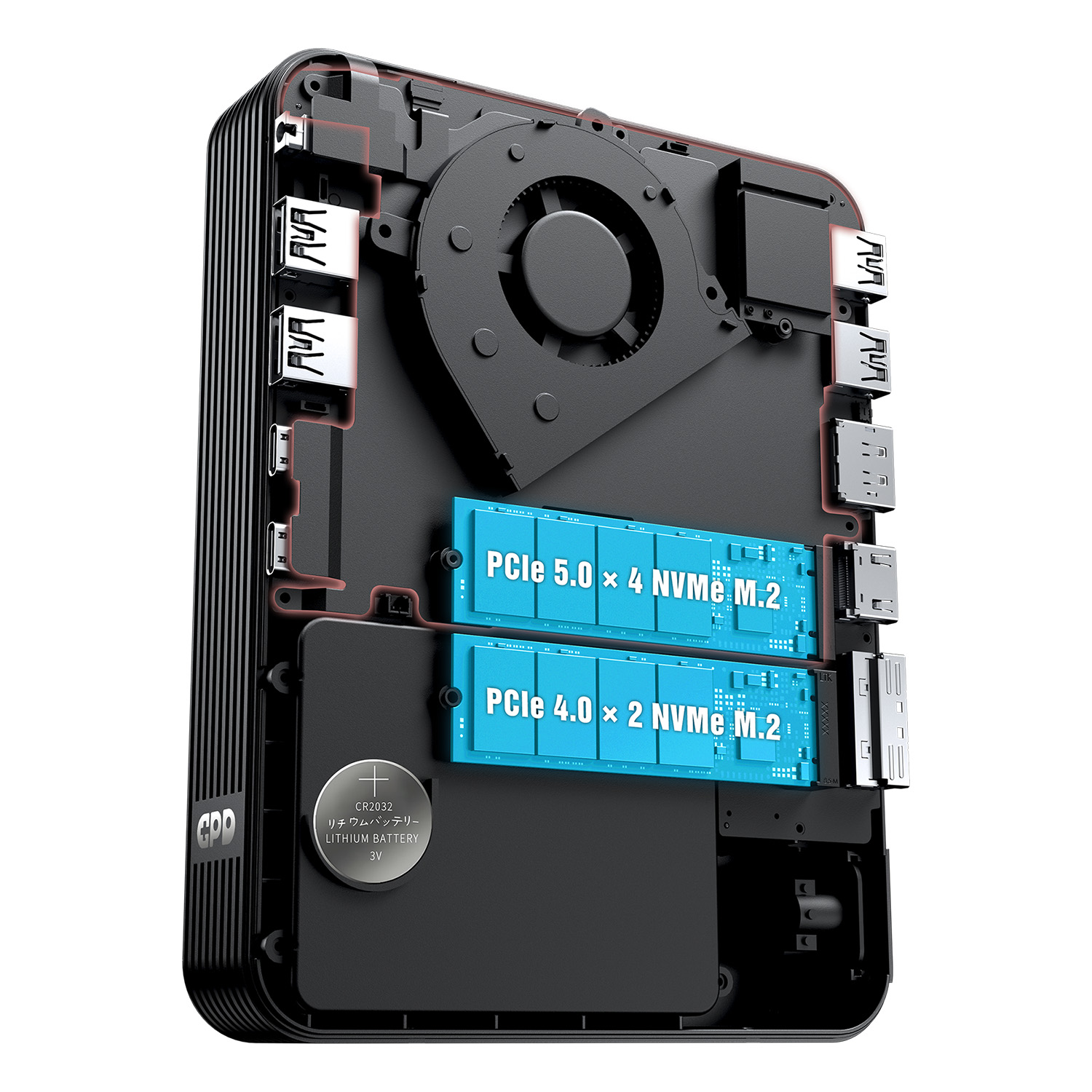 Internal layout diagram of a compact GPD computer or dock. The image shows a large black centrifugal cooling fan at the top, two blue-highlighted M.2 SSD slots labeled "PCIe 5.0 x 4 NVMe M.2" and "PCIe 4.0 x 2 NVMe M.2," and a silver CR2032 lithium battery. Various internal port headers are visible along the edges of the black chassis.