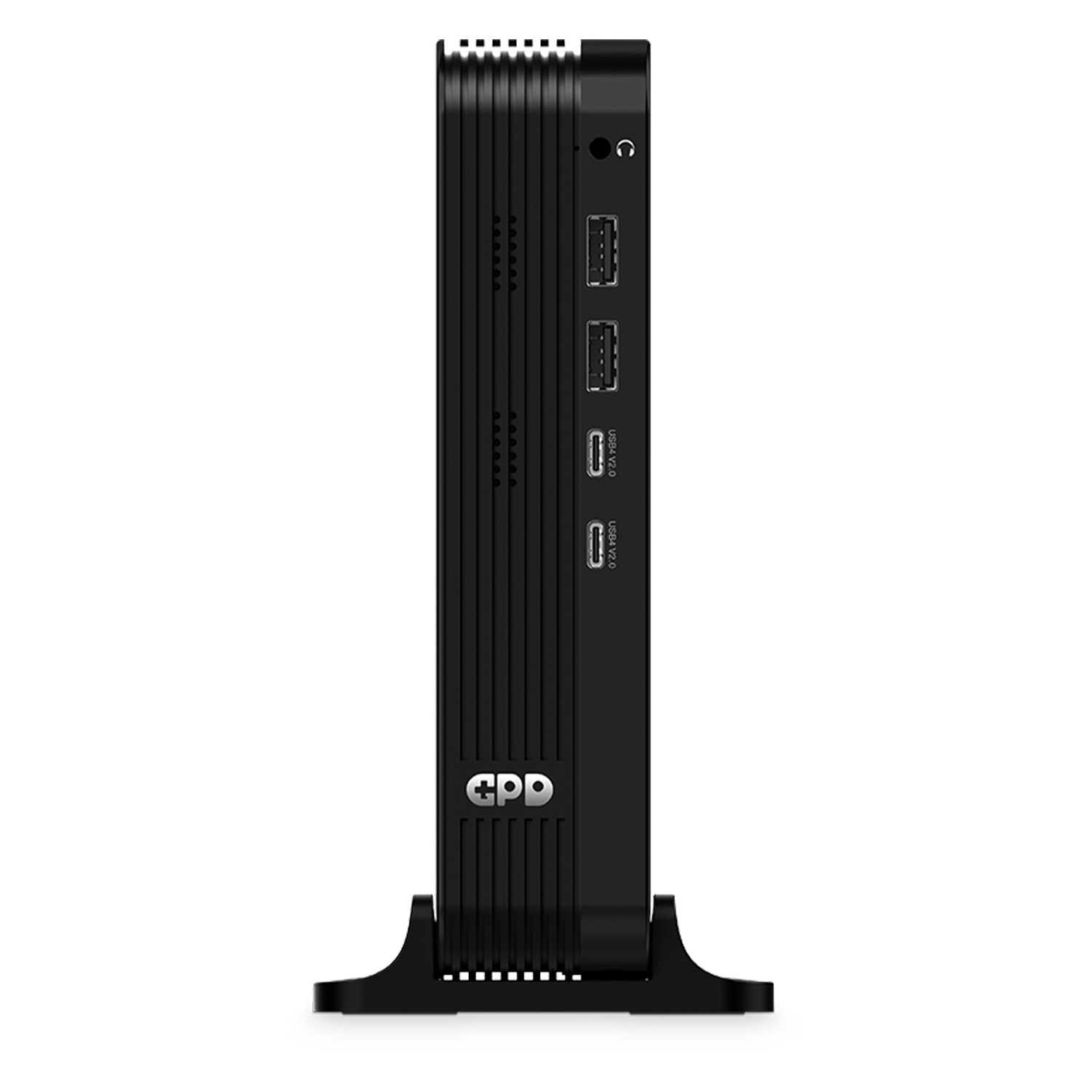 A vertical product shot of the front I/O panel of a black GPD eGPU or mini-PC. The device features a ribbed texture and is mounted in a stable black desk stand. From top to bottom, the ports include a headphone jack, two USB 3.2 Type-A ports, and two USB4 Version 2.0 Type-C ports. The silver GPD logo is positioned near the base.