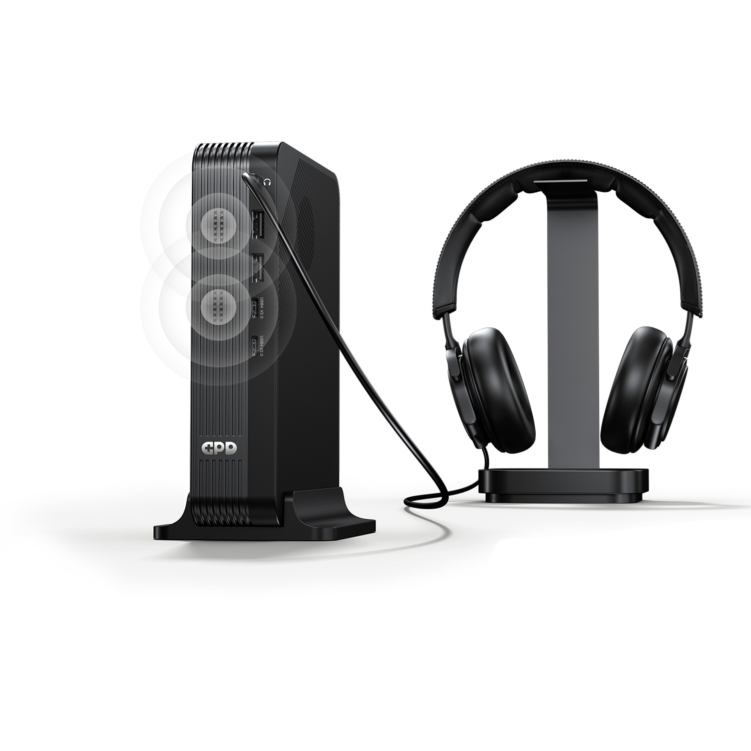 A marketing image showing the GPD device vertically docked. A cable connects its top audio jack to a pair of black over-ear headphones sitting on a stand. Faint white concentric circles emanate from the front of the unit, illustrating the built-in speaker functionality alongside the wired audio output.