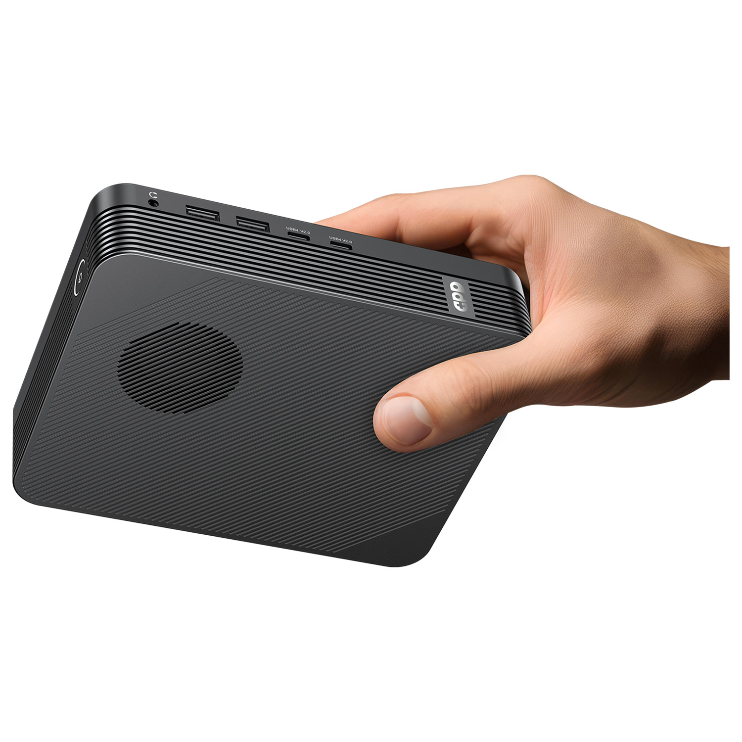 A person's hand holds the matte black GPD unit horizontally against a white background, highlighting its small, handheld form factor. The side profile clearly shows the headphone jack, dual USB-A ports, and dual USB4 V2.0 ports.